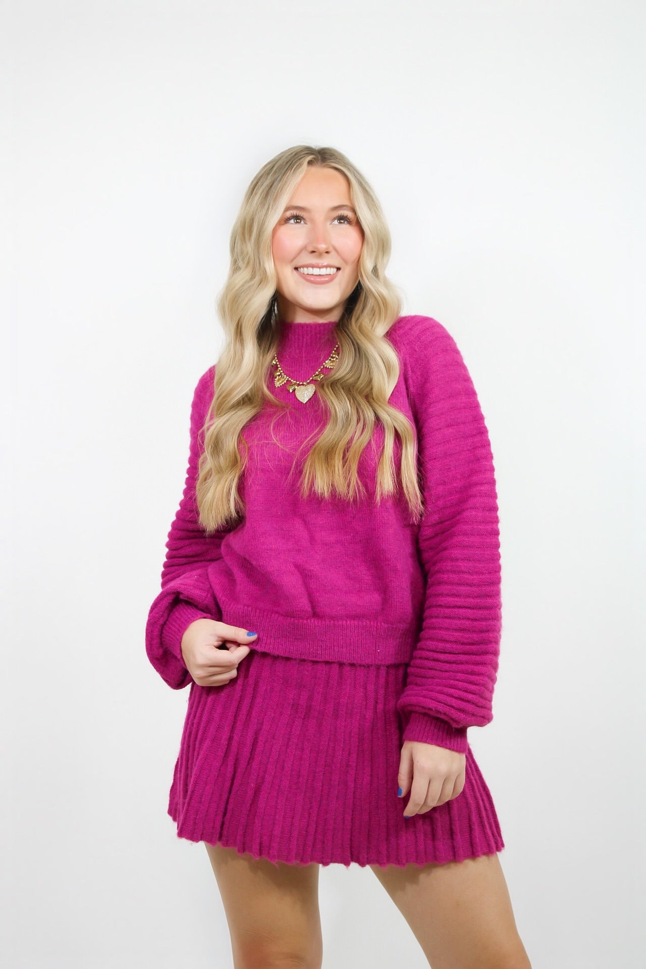 Emily is 5'6 wearing a size x-small.Rachel is 5'3 wearing a size x-small.- Sweater Set.- Pleated Skirt.- True to Size.