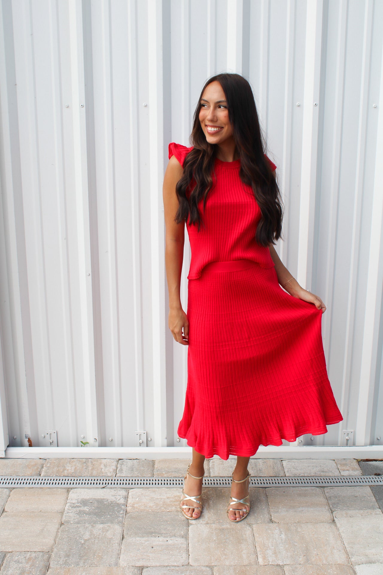 Chloe is 5'2 wearing an X-small.- Ribbed sweater set.- Ruffle sleeves.- Elastic waistband.