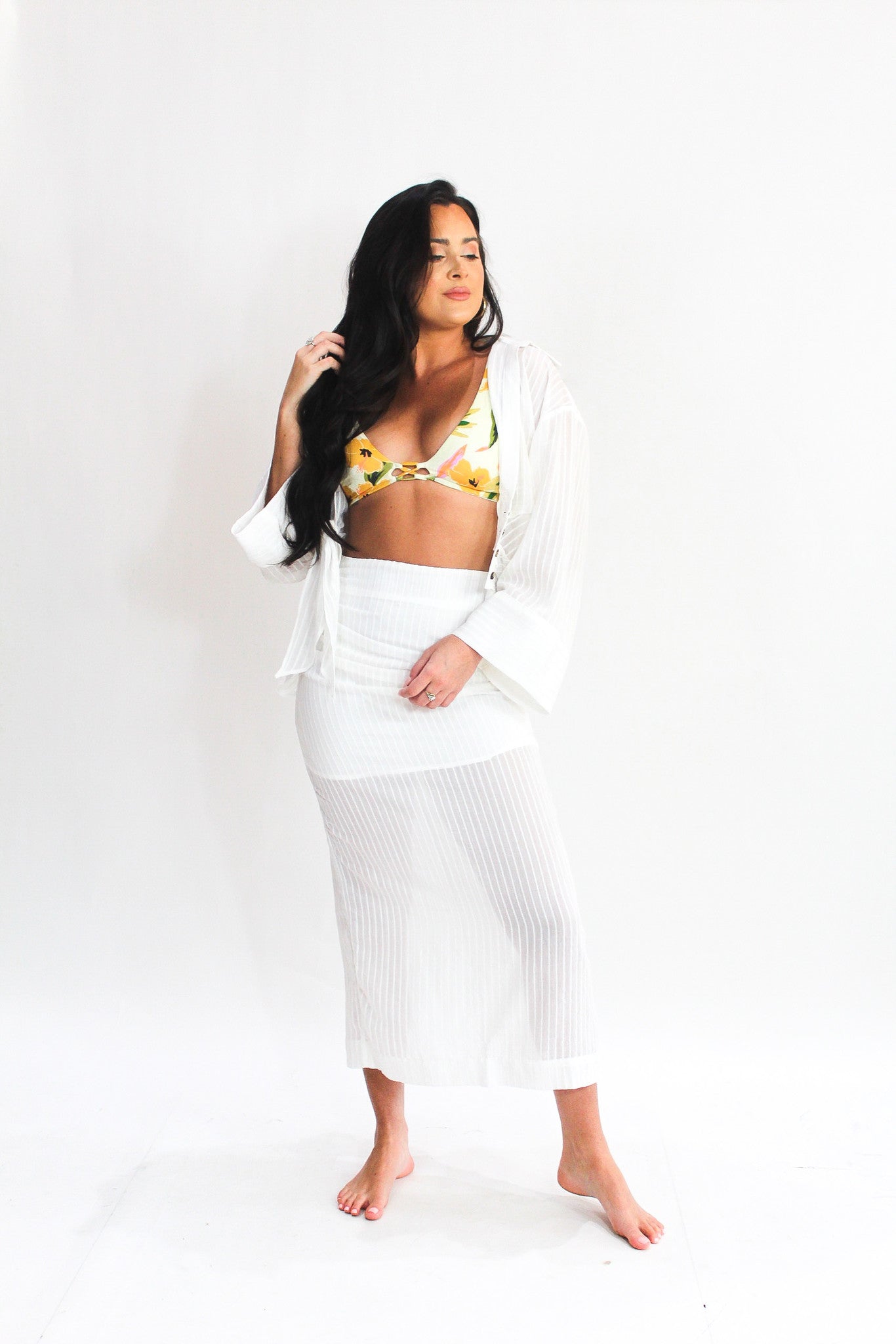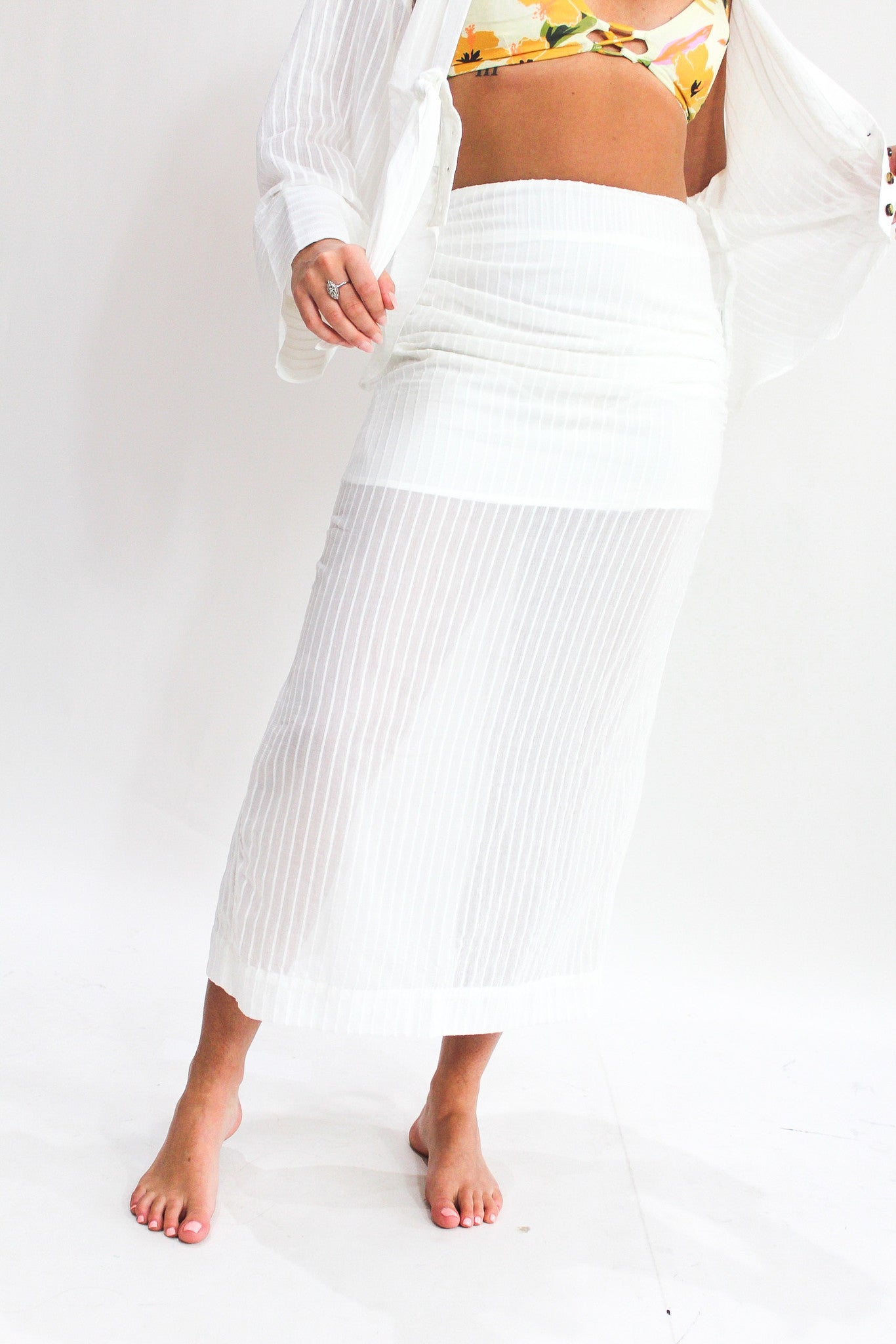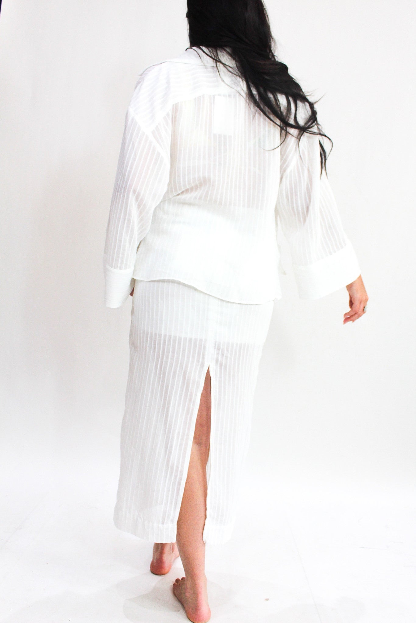 Two-Piece White Set- Button up top with front tie option- RIbbed fabric- Zip-up skirt