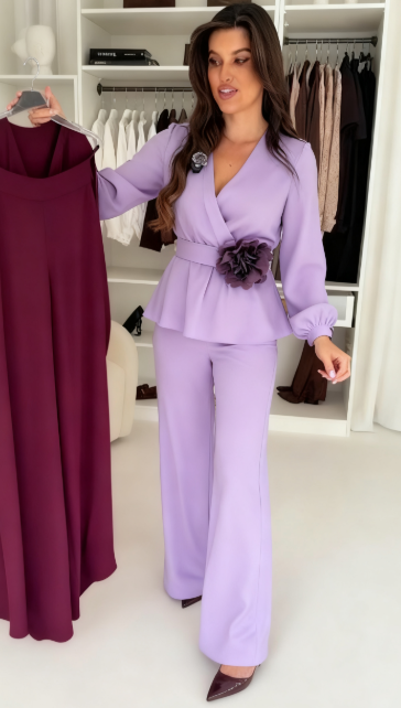 Rękodzielniczy kwiatowy detal na talii z asymetrycznym krojem bluzki i szerokimi spodnicami z prostym, jednorodnym designem tworzą idealną parę – zarówno artystyczną, jak i bardzo praktyczną. Dbałość o detale, jak np. subtelna textura rękodzielniczego kwiatu, sprawia, że zestaw nie jest zwykły, ale bardzo dopracowany.