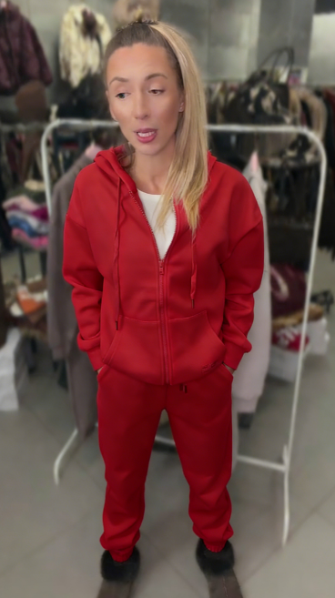 Kostium damski składa się z jednokolorowej bluzy z kapturem zapinanej na suwak oraz spodni dresowych.