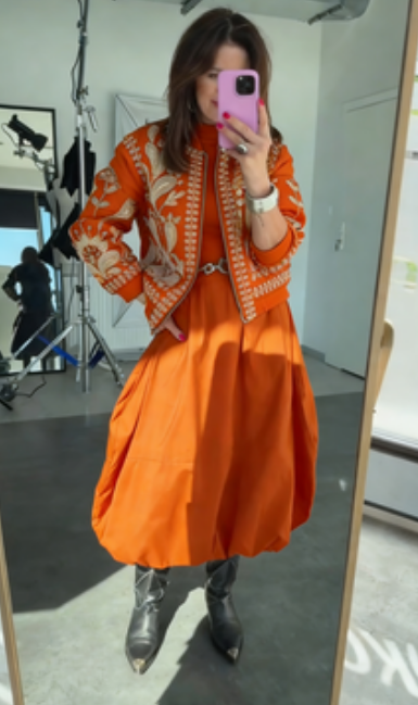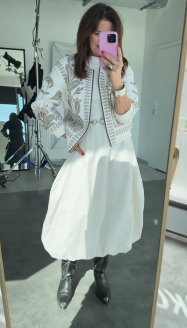 Sukienka z okrągłym dekoltem i haftowanym wzorem żakietu.