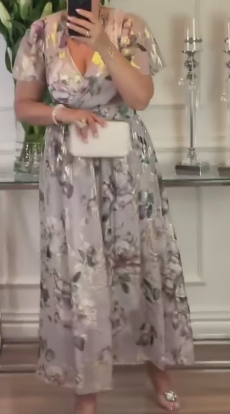 Przedstawiamy wyrafinowaną sukienkę midi – połączenie szaro-białego kwiatowego wzoru na błyszczącej tkaninie, luźnych rękawów i obfitą spodenką, idealna dla kobiet, które chcą być eleganckie i romantyczne na weselach lub gala. Ta sukienka to więcej niż tylko odzież: to symbol pewności siebie i subtelności, która sprawi, że czujesz się komfortowo i fashionable na każdej prestiżowej imprezie. Wykonana z wysokiej jakości materiału, z V-neck dekolcją i dopasowanym krojem, łączy funkcjonalność z artystycznym designem. Kwiatowy wzór dodaje romantyzmu, a błyszcząca tkanina nadaje luksusu – idealna na najważniejsze wydarzenia.