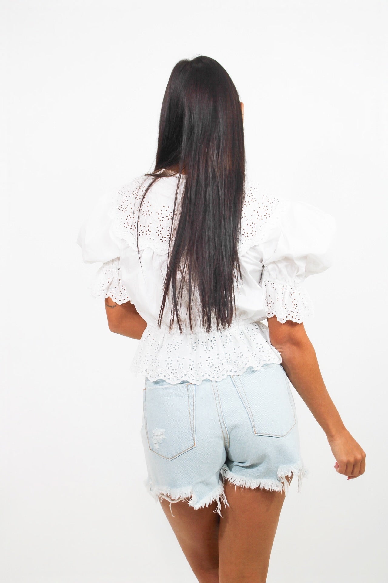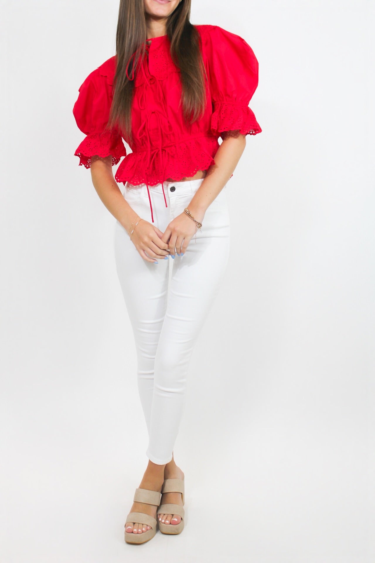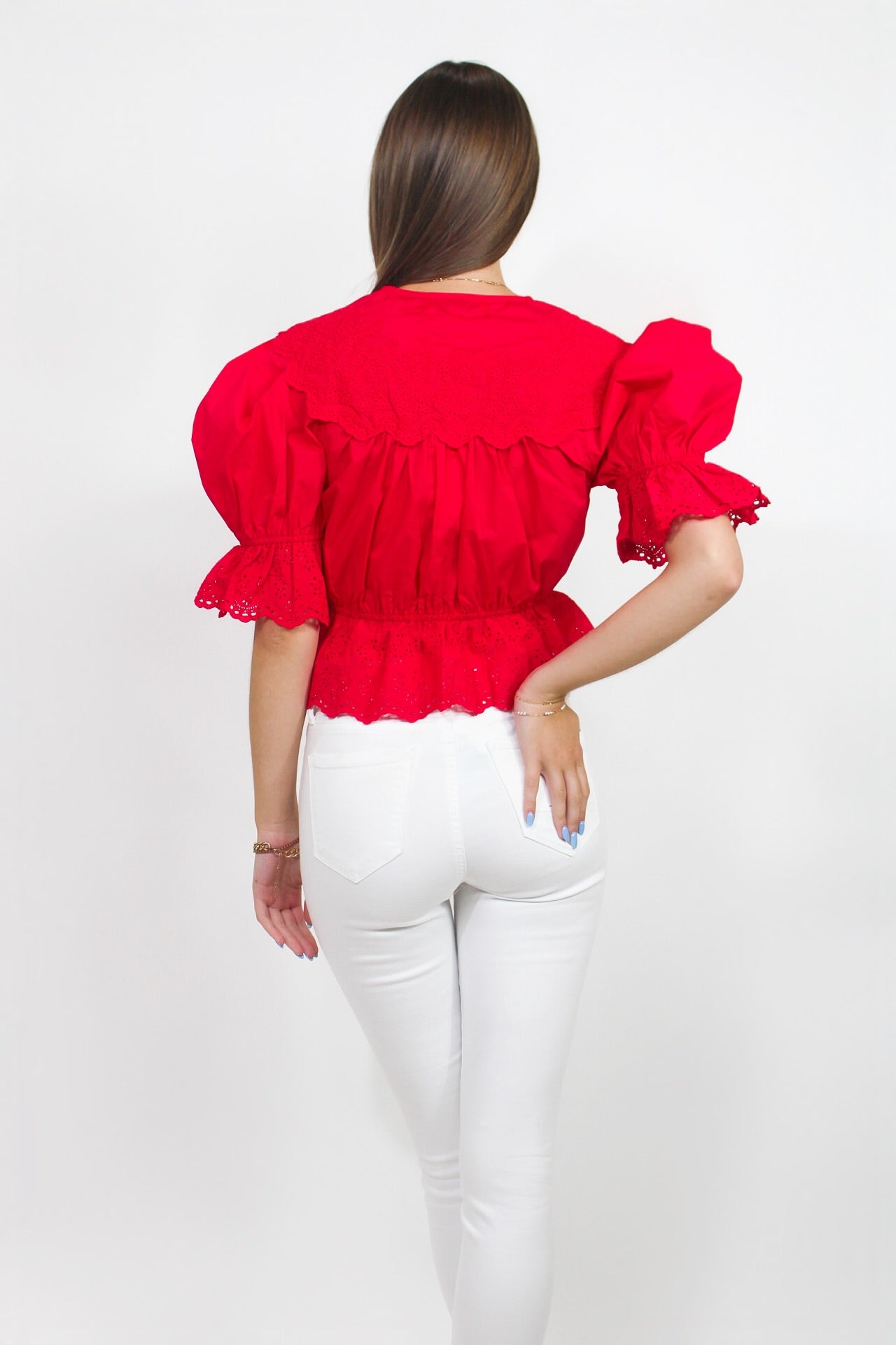 Chloe is 5'2 wearing a size small.Emily is 5'6 wearing a size small.- Puff Sleeve.- Waist Length.- True to Size.