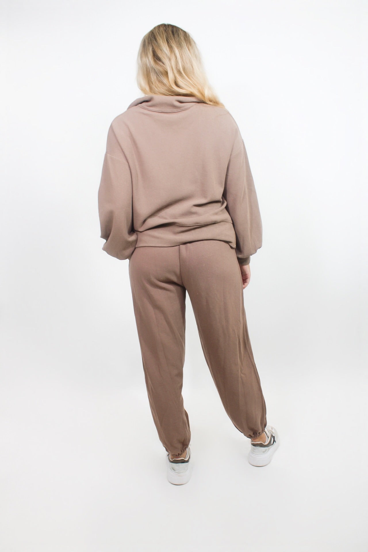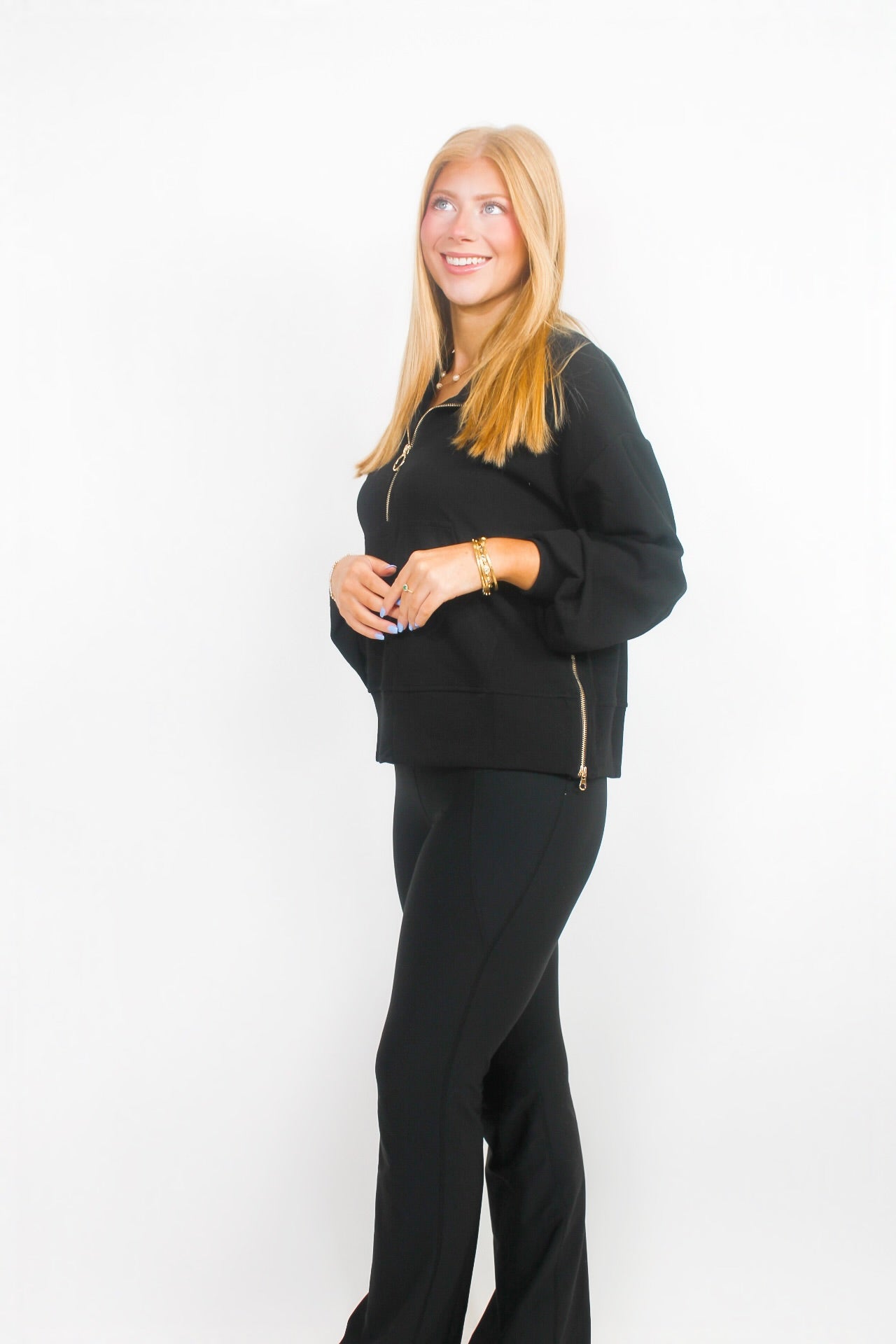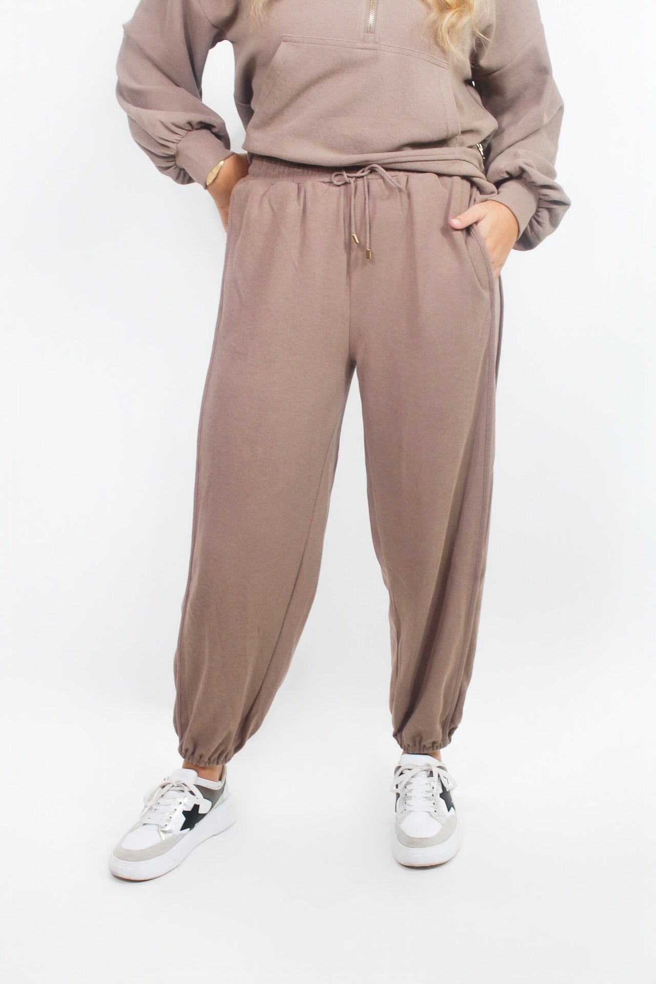 McCall is 5'5 wearing a small.Courtney is 5'6 wearing a small.- Drawstring waist.- Side zips.- Pullover and sweatpants set.
