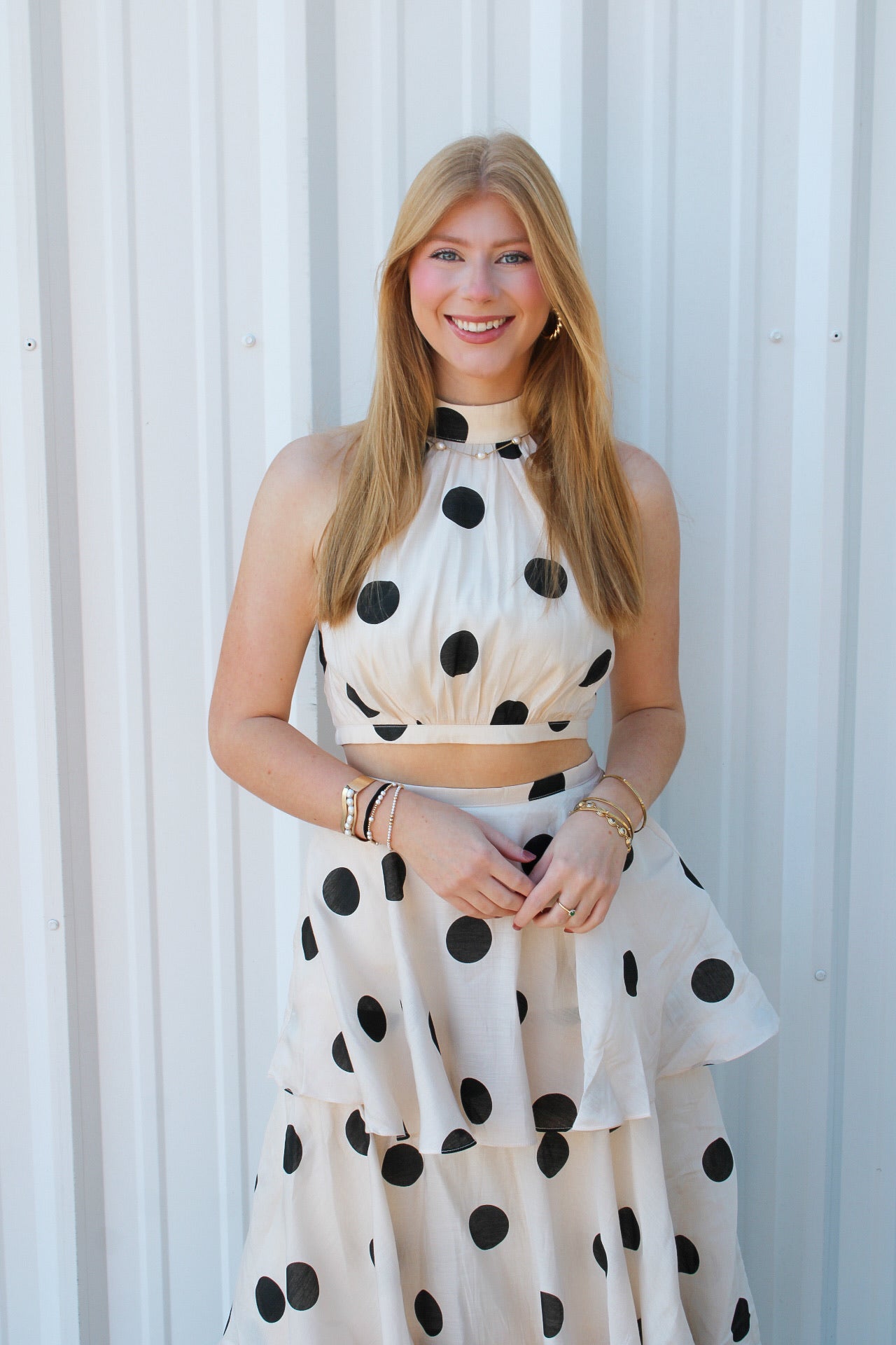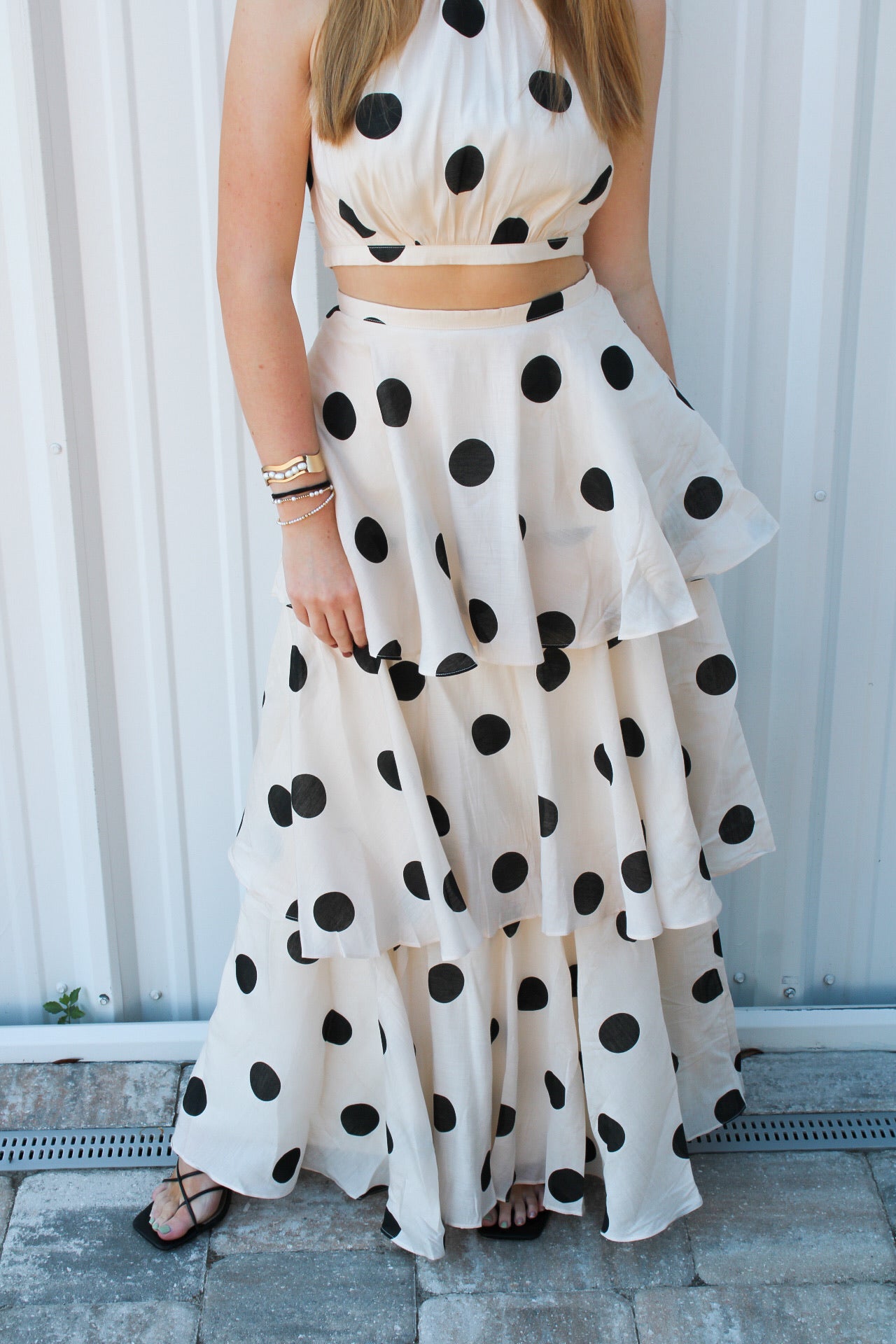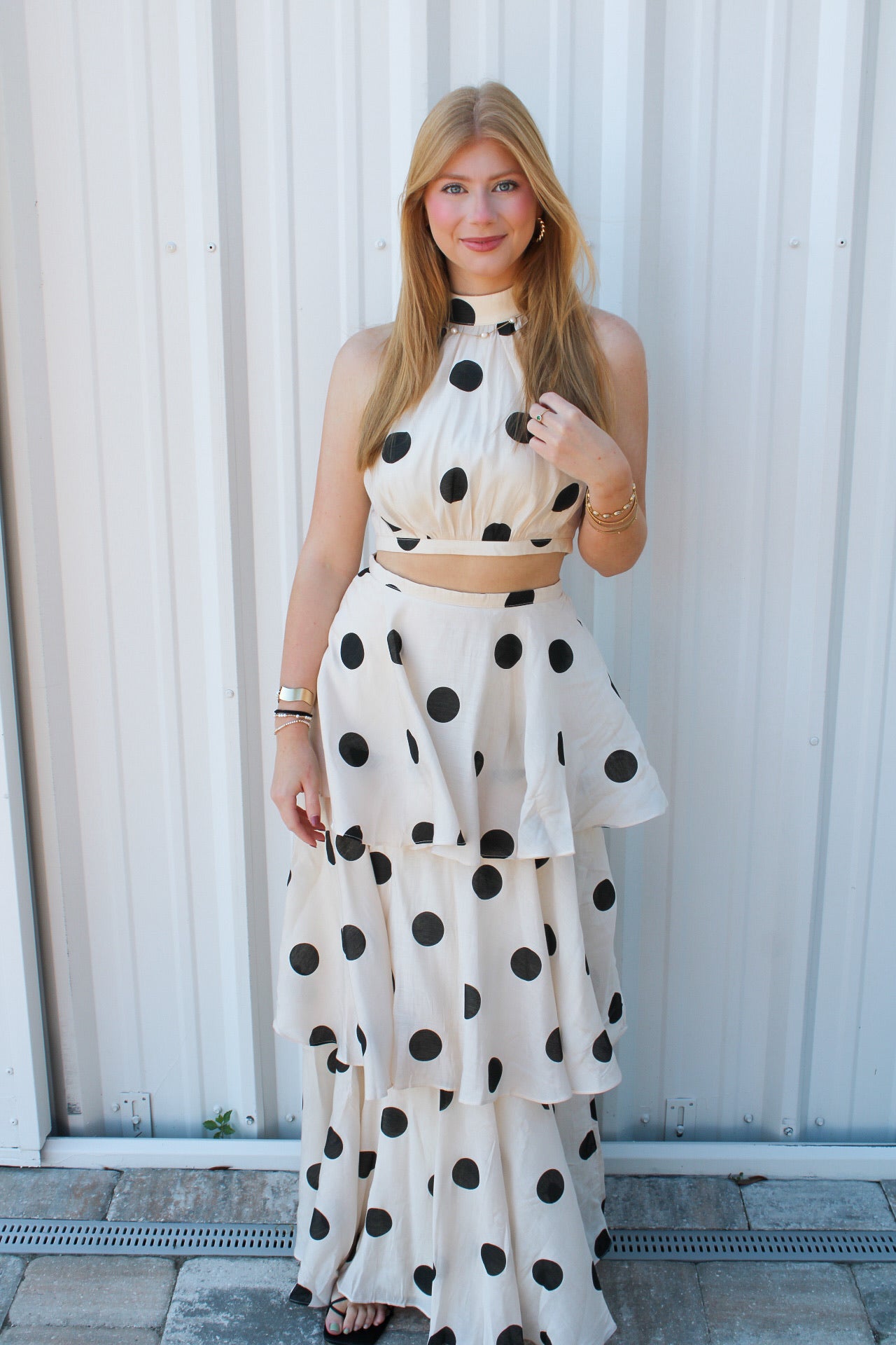 Courtney is 5'6 wearing a size small.- Two piece set.- Halter top.- Tiered ruffle skirt.- Skirt and top zip.